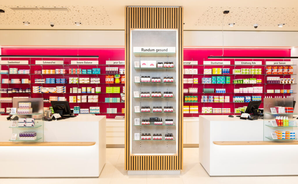 Nach einem Jahr Bauzeit eröffnete die Engel Apotheke im Mai dieses Jahres am neuen Standort. Das Ergebnis kann sich sehen lassen, findet Barbara Wache: „Wir wollten eine freundliche, helle und offene Atmosphäre schaffen, und ich glaube, dass uns das mit der Kombination aus Holz mit den Farben Weiß und Pink gut gelungen ist! Besonders angenehm ist die große Offizin mit 100 Quadratmetern. Hier haben unsere Kundinnen und Kunden viel Platz, mit unserer Unterstützung frei aus dem großen Sortiment zu wählen.“