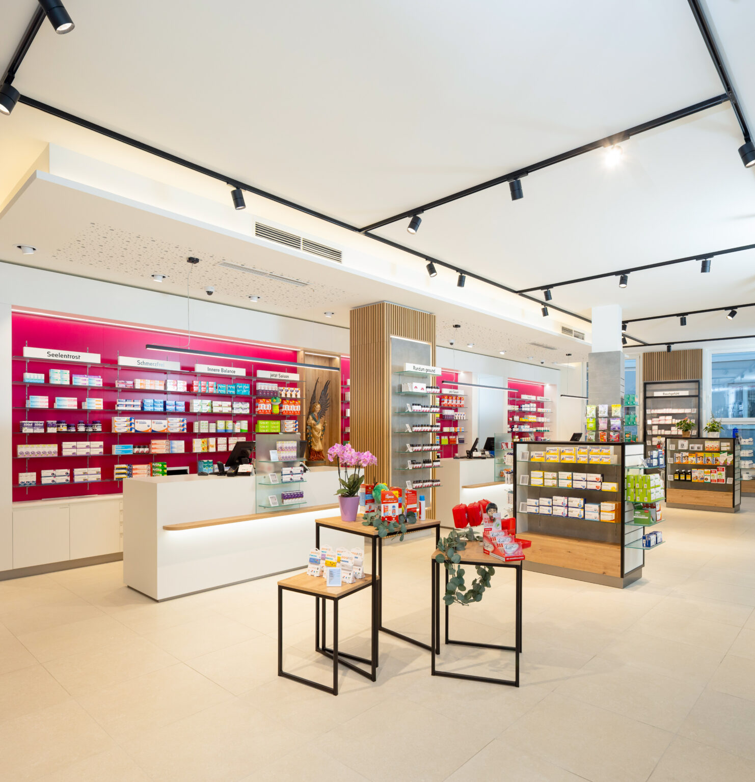 All das ist, wie das gesamte Gebäude, tipptopp modern, nur ein Relikt vom früheren Standort ist ins neue Geschäftslokal mitgezogen: der geschnitzte Erzengel Raphael, der mit hoch aufgerichteten Flügeln auf einem Sockel thront. Das ist doppelt passend, ist Raphael doch einer der Schutzpatrone der Apotheker*innen und zugleich Namensgeber der Engel-Apotheke. Barbara Wache: „Herr Klinger von der gleichnamigen Apothekenbau-Firma hat auf unseren Wunsch eine gut ausgestrahlte Nische an der Wand zwischen zwei Regalreihen dafür geschaffen. So vereinen wir Tradition mit Fortschritt. Das kommt bei unseren Stammkunden besonders gut an!“ Und die pinke Wand hinter den Taras? „Der Farbton war doch eher ein „Hoppala‘“, schmunzelt die Apothekerin: „Wir wollten die zarte Farbe unseres Logos zitieren, und herausgekommen ist ein eher kräftiges Pink. Aber das macht den ganzen Raum nur umso fröhlicher!“