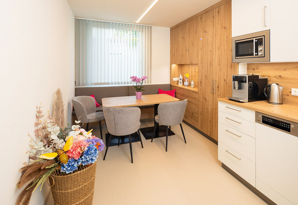 Die Gesamtfläche von 290 Quadratmetern habe vieles ermöglicht, das vorher nicht ging, erklärt die Apothekerin: „Wir haben einen separaten Beratungsraum für längere Patienten-gespräche, Messungen und Testungen, wie sie ja zukünftig auch von unserer Landesgeschäftsstelle im Rahmen von Projektwochen forciert werden sollen. Auch für Impfen in der Apotheke wären wir bestens gerüstet! Ein Extrawunsch von mir war der gut ausgestattete Sozialraum, denn die meisten unserer Mitarbeiterinnen und Mitarbeiter bleiben auch über die Mittagspause in der Apotheke.“